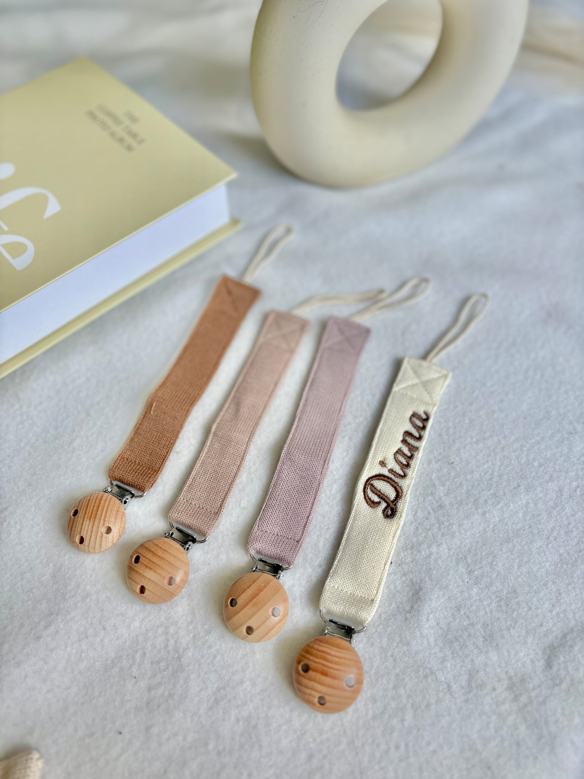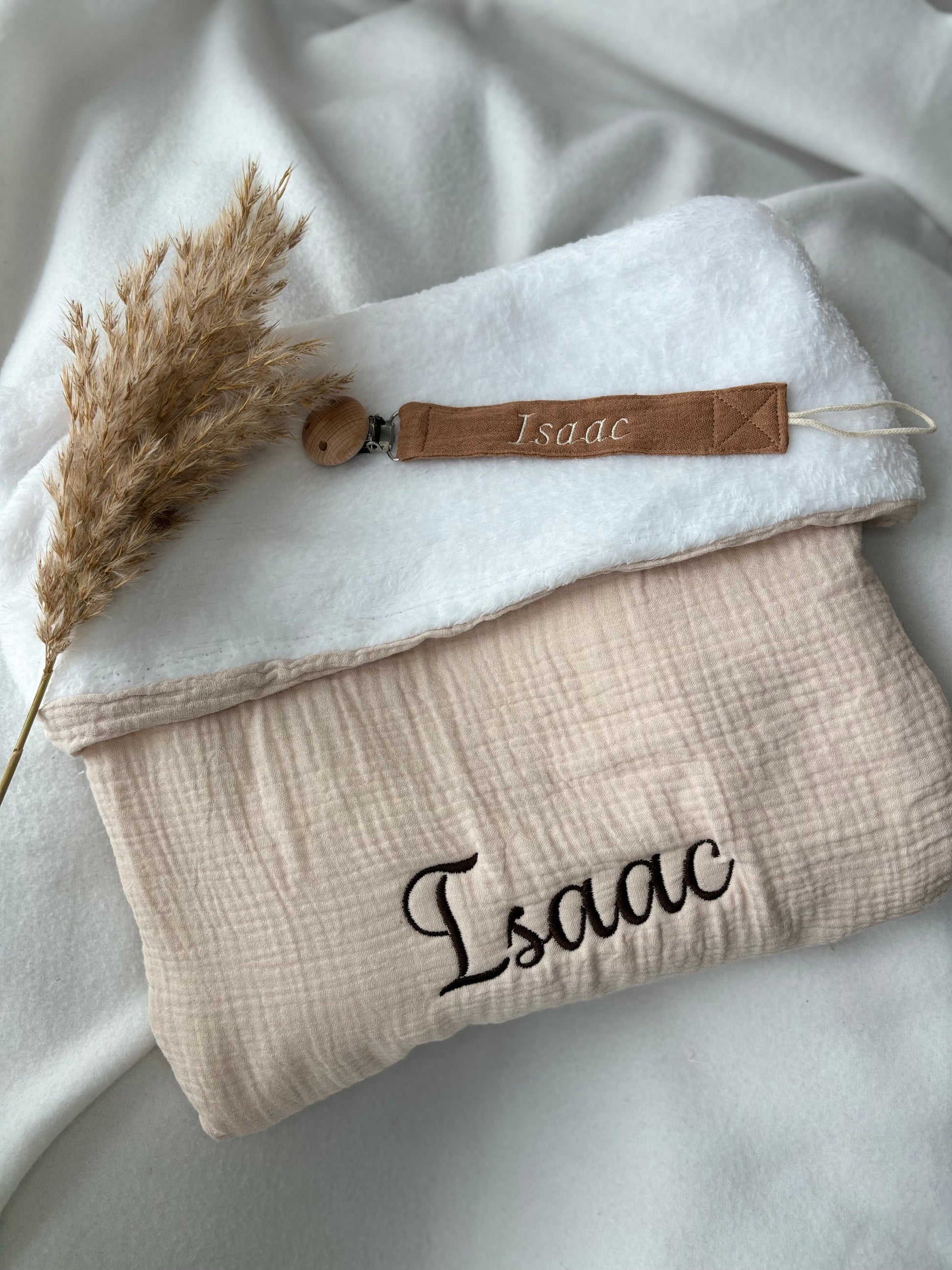 Notre attache-tétine en gaze de coton douce et naturelle, avec le prénom de bébé brodé avec soin. Pratique, élégante et pleine de charme, elle évite que la tétine tombe ou se perde, tout en ajoutant une touche unique et raffinée au quotidien.