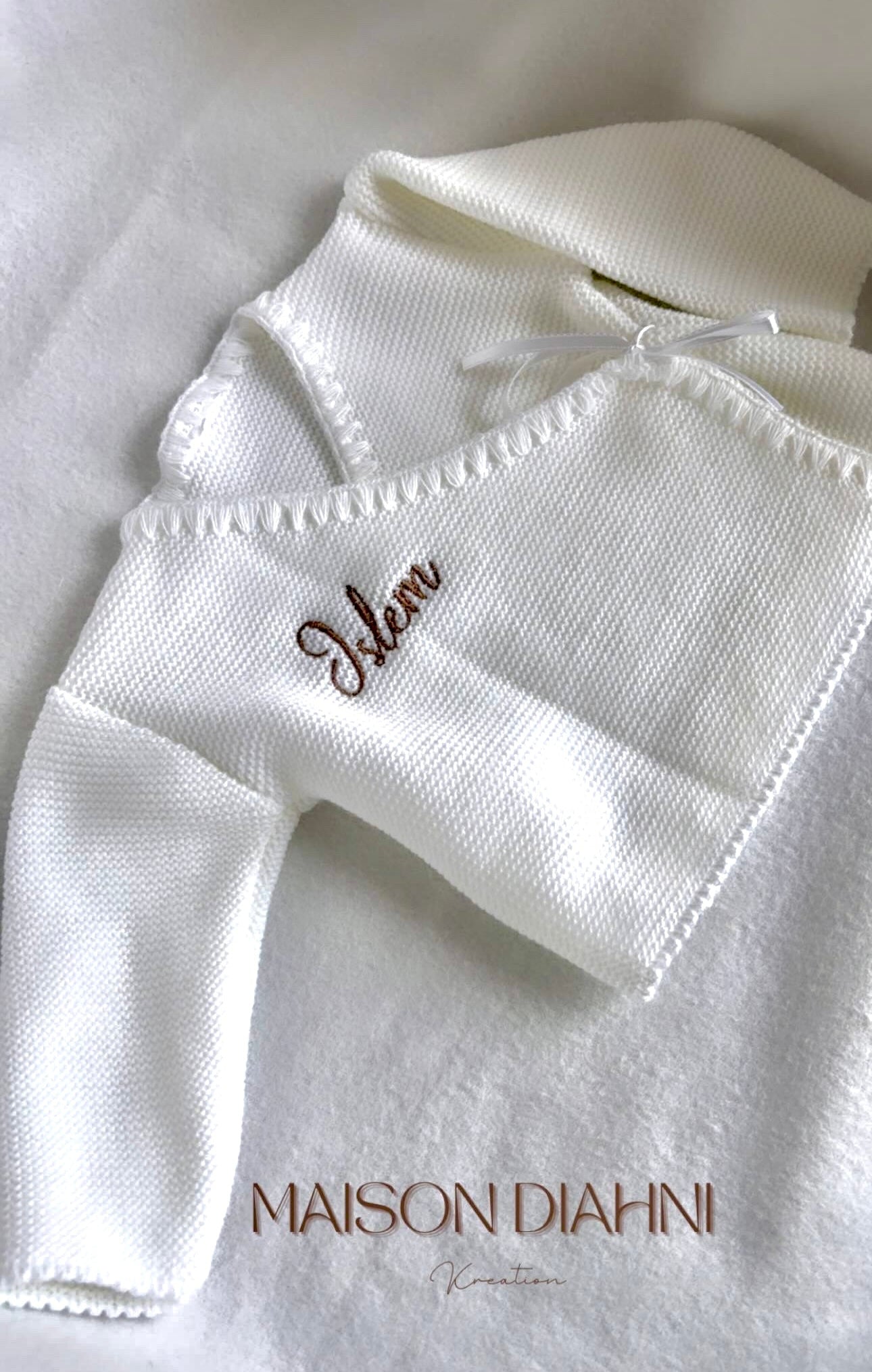 Notre brassière en maille, brodée au prénom de bébé, est pensée pour envelopper votre nouveau-né de douceur et d'élégance.
