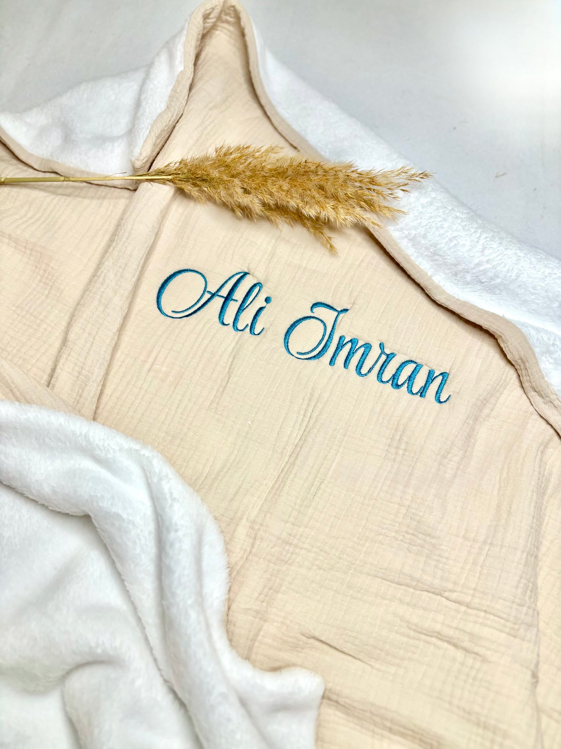 Confectionnée dans une double gaze 100% coton et doublée d'une matière ultra douce, cette couverture élégante est idéale pour envelopper bébé avec tendresse, dés la naissance.