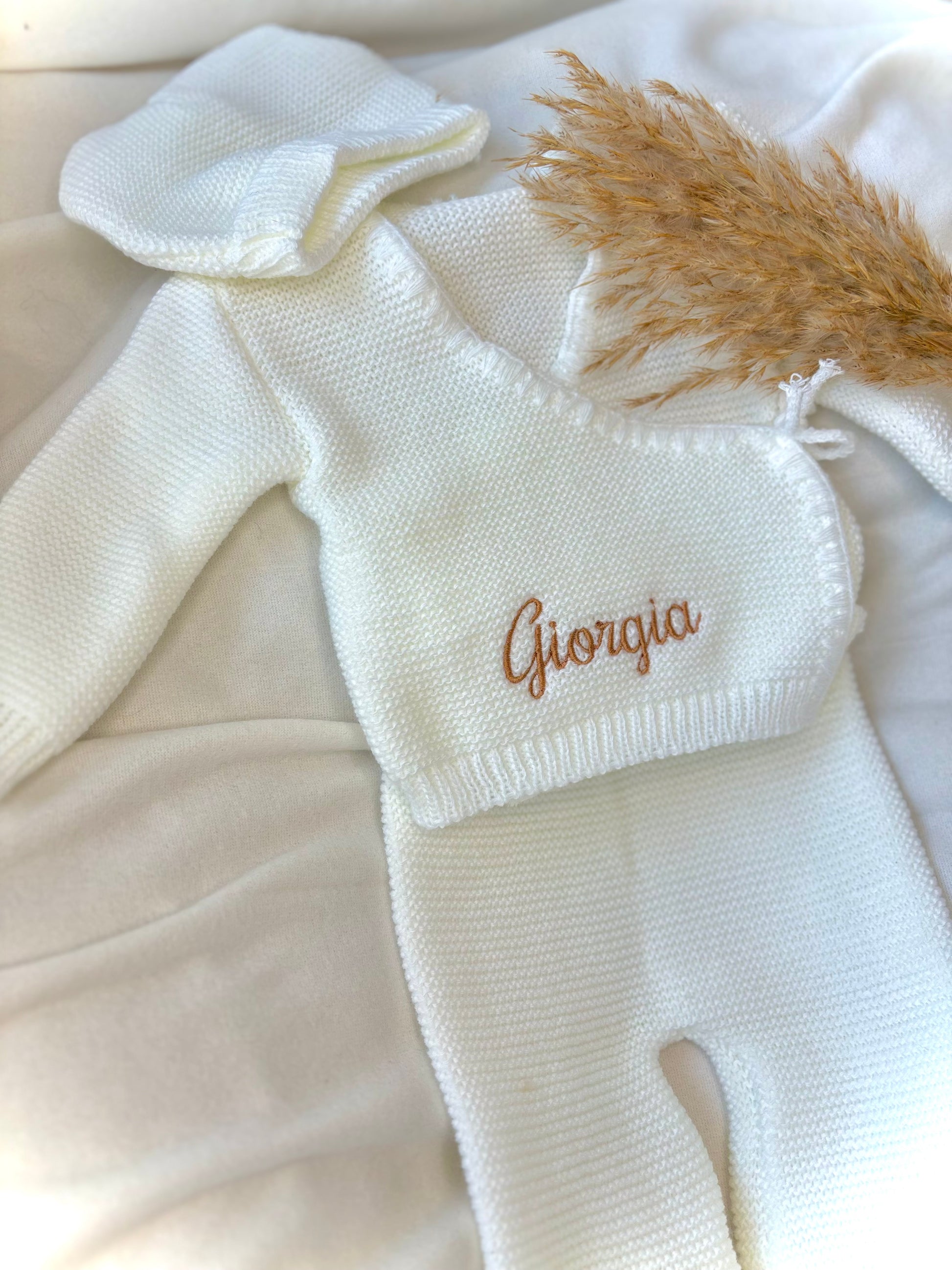 Parfait pour les premières sorties ou pour envelopper bébé à la maternité, cet ensemble est pensé pour allier élégance, confort et chaleur.